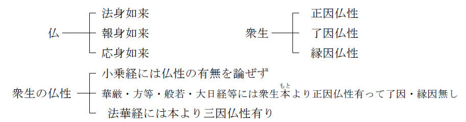 文句の十に云はく「正因仏性は 法身の性なり 本当に通亘す。縁了仏性は種子本有にして今に適むるに非ざるなり」と。