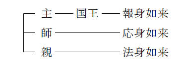 法華経第二に云はく「今此の三界は皆是我が有なり」 主・国王・世尊なり。 「其の中の衆生は悉く是吾が子なり」 親父なり。 「而も今此の処は諸の患難多し。唯我一人のみ能く救護を為す」 導師。 寿量品に云はく「我も亦これ世の父」文。