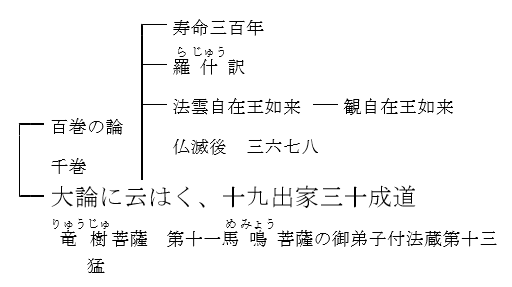 竜樹の寿命は三百年といわれている 大智度論は、羅什が訳す。 竜樹の本地は法雲自在王如来である。また観自在王如来ともいう。 大智度論は百論からなり、インドの原本は千巻である。 竜樹の出現は仏滅後六百七十八年である。 大智度論には、釈尊は十九歳で出家し、三十歳で成道したとある。 竜樹菩薩は付法蔵の第十一、馬鳴菩薩の御弟子で、付法蔵の第十三である。 └竜猛菩薩ともいう。 竜樹の著作は三十万巻ともいわれている。内訳は 大悲方便論 十万巻 大 心 論 十万巻 大無 畏論 十万巻、となる。 |