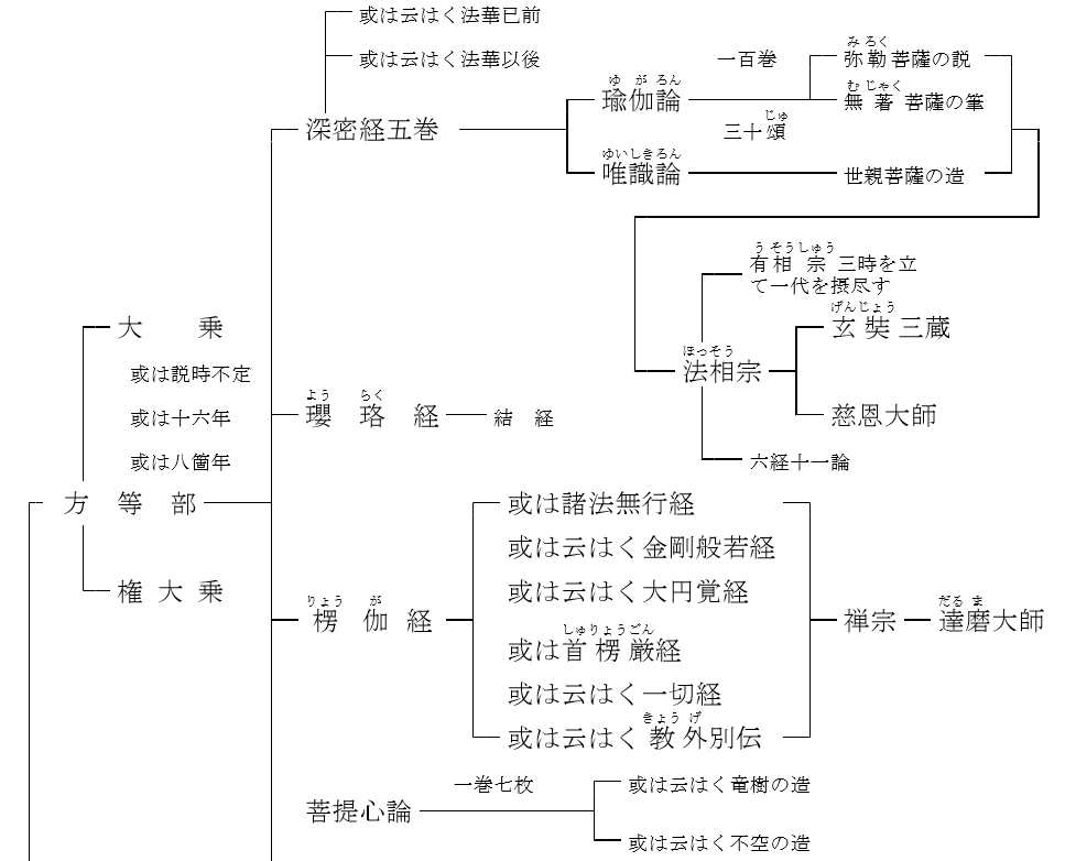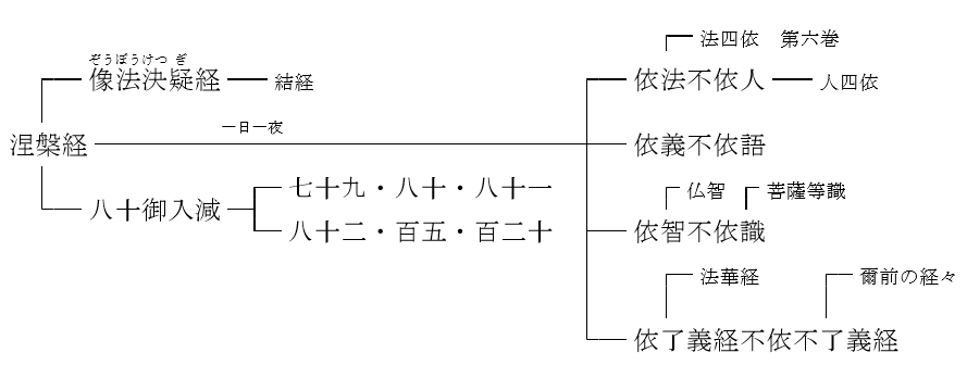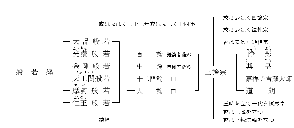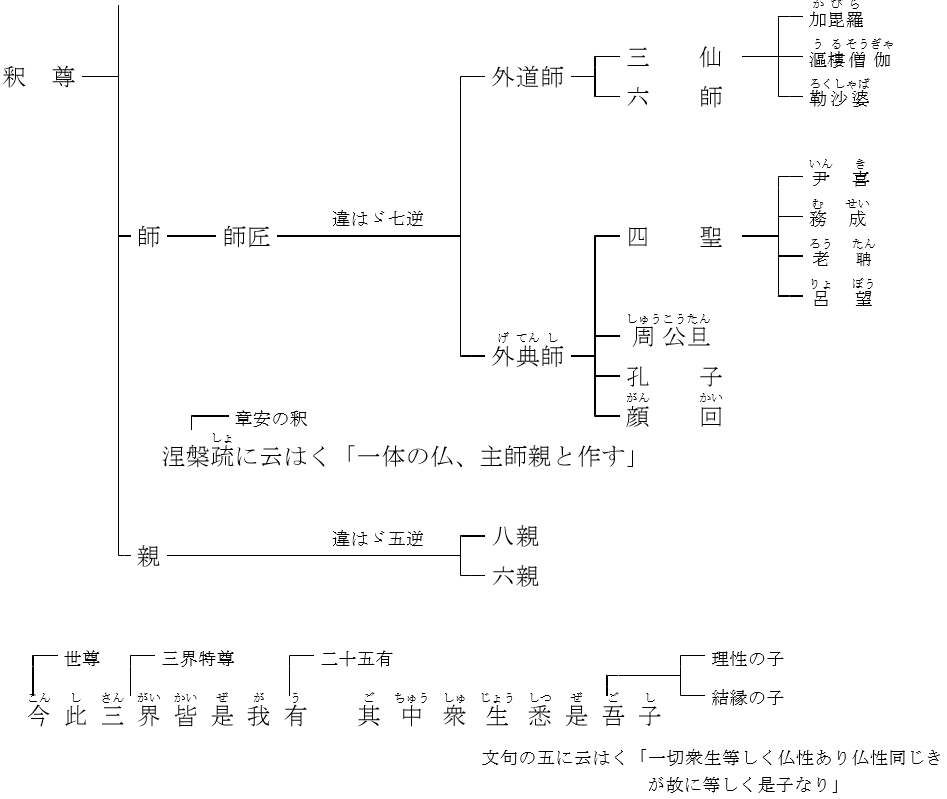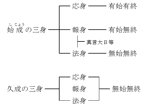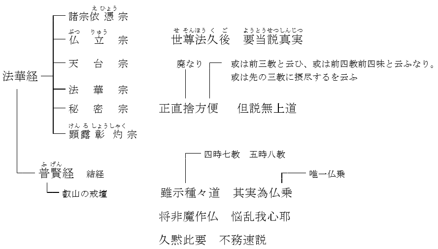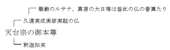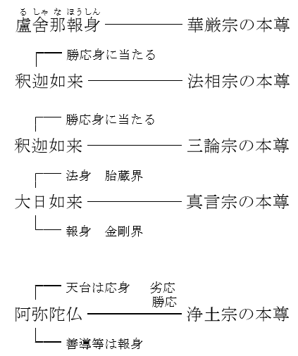 | 華厳宗真言宗の無始無終の三身を立つるは、天台の名目を盗み取りて自らの依経に入れしなり。 | 華厳宗・真言宗の無始無終を立てているのは、天台宗の呼称を盗み取って自宗の依経に入れたのである。 |