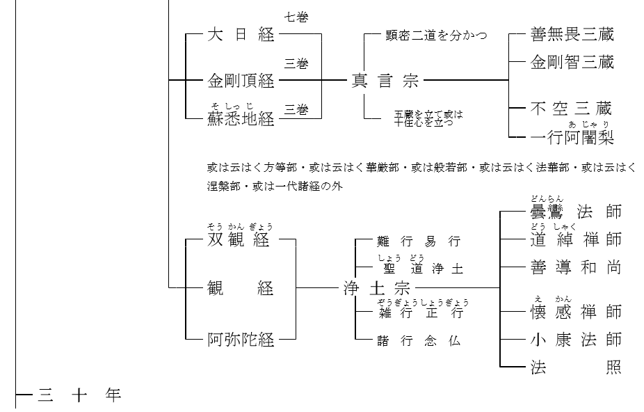 華厳三七日・阿含十二年・方等般若三十年・已上四十二年なり。 法界性論に云はく四十二年 無量義経に云はく「方便力を以ての故に四十余年には未だ真実を顕はさず」 又云はく「無量無辺不可思議阿僧祇劫を過ぐるとも終に無上菩提を成ずることを得ず。所以は何。菩提の大直道を知らざる故、険径を行くに留難多きが故に」 又云はく「大直道を行けば留難無きが故に」 |
