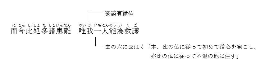記の九に云はく「初め此の仏菩薩に従って結縁し、還此の仏菩薩に於て成就す」 玄の六に云はく「仏尚自ら分段に入って仏事を施作す。有縁の者何ぞ来たらざるを得ん。譬へば百川の海に潮すべきが如し。縁に牽かれて応生すること亦復是くの如し」 又云はく前に之を書す「本此の仏に従って初めて道心を発こし、亦此の仏に従って不退の地に住す」 |