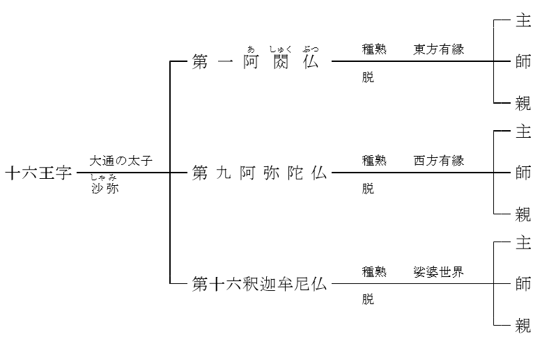 玄の六に云はく「本、此の仏に従って初めて道心を発こし、亦此の仏に従って不退の地に住す」 文句の六に云はく「旧は西方の無量寿仏を以て、以て長者を合す。今は之を用ひず。西方は仏別に縁異なり。仏別なる故に隠顕の義成ぜず。縁異なる故に子父の義成ぜず。又此の経の首末に全く此の旨無く。眼を閉ぢて穿鑿す○舍那の著脱は近けれども尚知らず。弥陀は遠きに在り、何んぞ嘗て変換せん」云云。 記の六に云はく「西方等とは弥陀・釈迦の二仏既に殊なり。豈、弥陀をして珍玩の服を隠さしめ、乃ち釈迦をして弊垢の衣を著せ使めん。然も釈迦は珍服の隠すべき無く、弥陀は唯勝妙の形なるに当たる。況んや宿昔の縁別に化道同じからざるをや。結縁は生の如く成就は養の如し。生養の縁異にして父子成ぜず。珍弊、途を分かち著脱殊に隔たり、経を消する事欠け調就の義乖けり。当部の文に永く斯の旨無し。舍那著脱等とは、舍那の動せずして而も往くに迷へり。弥陀の著弊は諸教に文無し。若し平等意趣を論せば彼此奚んぞ嘗て自ら矜らん。縦ひ他を我が身とするも還って我が化を成ず。我他の像を立つれば乃ち他の縁を助く。人之を見ざれば化縁便ち乱る。故に知んぬ、夫の結縁とは並びに応身に約することを。我昔曽て二万億等と云ふが如し。況んや十六王子の始めより今に至りて機感相成し任運に分解するをや。是の故に彼の弥陀を以て此の変換となすべからず」と。 |