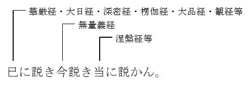 已 華厳経・大日経・深密経・楞伽経・大品経・般若経等 今 無量義経 当 涅槃経等 法華経法師品第十に「私が説いた経典は無量千万億という計り知れないほどになるが、已に説いた経、今説いている経、これから当に説こうとする経はある。しかしその中において、この法華経が最も信じ難く解し難い」とある。法華文句記の六には「たとえ経があって諸経の王とはいっても、已今当説最為第一とはいっていない。兼・但・対・帯の意義を知るべきである」とある。法華玄義の三には「軽慢を止めなければ舌が口の中で爛れる」とある。法華玄義釈籤の三には「已今当の妙について、頑なに迷い誹謗すれば、今世において受ける、舌が爛れて止むことなき報いはまだ華のようなもので、謗法の罪の苦しみは来世の長い劫にわたる」とある。また、同じく法華玄義釈籤には「法華経が究極の法であるのに、華厳・般若経が勝れているといい諌暁しても止めない場合は、舌が爛れる」とある。 |